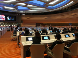 Notre guide nous a par la suite fait découvrir plus en détail la vie des diplomates à l'ONU. Par exemple, nous avons pu découvrir que des examens universels ont lieu durant lesquels les 193 États signataires de la charte de l'ONU participent. Représentés par leurs diplomates, ils sont évalués sur les mesures prises dans leurs pays. Chaque État a donc 1min05 de temps de parole dans l'une des 6 langues de l'ONU (anglais, russe, français, mandarin, espagnol, arabe).